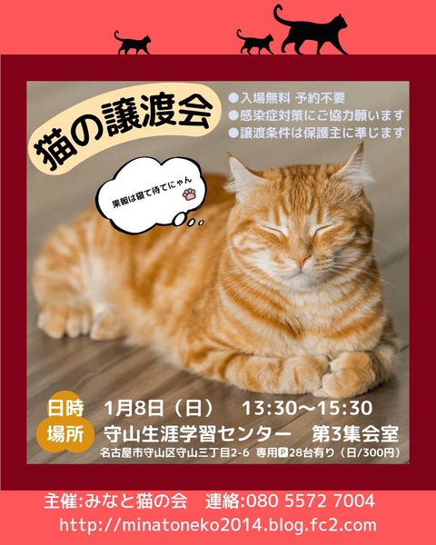 | イベント内容 | 名古屋市内で保護猫の譲渡会をほぼ毎週開催しております! TNR・地域猫活動をする中で多数の猫を保護し、里親様探しもしています。 ケアして人馴れ修行した猫たちが参加します ●会場は ・駐車場有 ・予約不要&入場無料 ●参加猫は ・子猫も成猫も全頭ワクチン接種済 ・ノミダニ駆除済 ・トイレ躾済 ・ケージレストのトレーニング済 写真2枚目 マッシュ ♂ 5ヶ月 写真3枚目 まりも ♀ 4ヶ月 ●参加する猫たちについて 基本治療やトイレのしつけは済んでいます 足りないのは共に生きる新しい家族だけです 「譲渡会は行ったことがなくて不安…」 「猫を飼うのははじめて」 「今すぐじゃないけどいずれ猫と暮らしたい」 そんな皆様も大歓迎! ●譲渡に関して ※完全室内飼い・誓約書・治療費負担等の 諸条件があります。 ※譲渡やトライアルに関する契約条件は 猫の保護主によって異なります。 ●譲渡会その他についての問い合わせは みなと猫の会 minatonekonokai@gmail.comもしくは 080-5572-7004 までお願いします。 ●感染症の拡大防止にご協力願います ・会場内での手指消毒にご協力ください ・定期的に換気作業を行います ・マスク等の使用をお願いします ●次回以降の譲渡会予定 日時:2023年1月15日(日) 13:30-15:30 場所:守山生涯学習センター 2階 第3集会室 名古屋市守山3丁目2-6 ゆとりーとライン「守山」下車 東隣り 日時:2023年1月22日(日) 13:30-15:30 場所:動物医療センター もりやま犬と猫の病院 新館2階 会議室 愛知県名古屋市守山区深沢2-101 ゆとりーとライン「志段味西小学校」バス停留所 徒歩2分 ♪Leeloo待ち猫の会さんと合同開催♪ 日時:2023年1月29日(日) 13:30-15:30 場所:熱田生涯学習センター 2階 視聴覚室&第3集会室 名古屋市熱田区熱田西町2-13 地下鉄名城線「神宮西」駅より徒歩12分 詳しくは下記ブログをご覧ください。 ◎主催者ブログ みなと猫の会 ~こぴっと猫だより~ http://minatoneko2014.blog.fc2.com/ |