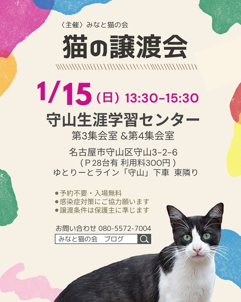| イベント内容 | 名古屋市内で保護猫の譲渡会をほぼ毎週開催しております! TNR・地域猫活動をする中で多数の猫を保護し、里親様探しもしています。 ケアして人馴れ修行した猫たちが参加します ●会場は ・駐車場有 ・予約不要&入場無料 ●参加猫は ・子猫も成猫も全頭ワクチン接種済 ・ノミダニ駆除済 ・トイレ躾済 ・ケージレストのトレーニング済 写真2枚目 白くん ♂ 8ヶ月 写真3枚目 えびせん ♂ 8ヶ月 ●参加する猫たちについて 基本治療やトイレのしつけは済んでいます 足りないのは共に生きる新しい家族だけです 「譲渡会は行ったことがなくて不安…」 「猫を飼うのははじめて」 「今すぐじゃないけどいずれ猫と暮らしたい」 そんな皆様も大歓迎! ●譲渡に関して ※完全室内飼い・誓約書・治療費負担等の 諸条件があります。 ※譲渡やトライアルに関する契約条件は 猫の保護主によって異なります。 ●譲渡会その他についての問い合わせは みなと猫の会 minatonekonokai@gmail.comもしくは 080-5572-7004 までお願いします。 ●感染症の拡大防止にご協力願います ・会場内での手指消毒にご協力ください ・定期的に換気作業を行います ・マスク等の使用をお願いします ●次回以降の譲渡会予定 日時:2023年1月22日(日) 13:30-15:30 場所:動物医療センター もりやま犬と猫の病院 新館2階 会議室 愛知県名古屋市守山区深沢2-101 ゆとりーとライン「志段味西小学校」バス停留所 徒歩2分 ♪Leeloo待ち猫の会さんと合同開催♪ 日時:2023年1月29日(日) 13:30-15:30 場所:熱田生涯学習センター 2階 視聴覚室&第3集会室 名古屋市熱田区熱田西町2-13 地下鉄名城線「神宮西」駅より徒歩12分 詳しくは下記ブログをご覧ください。 ◎主催者ブログ みなと猫の会 ~こぴっと猫だより~ http://minatoneko2014.blog.fc2.com/ |