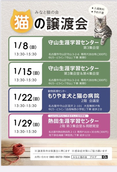 | イベント内容 | 名古屋市内で保護猫の譲渡会をほぼ毎週開催しております! TNR・地域猫活動をする中で多数の猫を保護し、里親様探しもしています。 ケアして人馴れ修行した猫たちが参加します ●会場は ・駐車場有 ・予約不要&入場無料 ●参加猫は ・子猫も成猫も全頭ワクチン接種済 ・ノミダニ駆除済 ・トイレ躾済 ・ケージレストのトレーニング済 写真2枚目 いっちー ♀ 7ヶ月 写真3枚目 キム兄 ♂ 2~3歳 ●参加する猫たちについて 基本治療やトイレのしつけは済んでいます 足りないのは共に生きる新しい家族だけです 「譲渡会は行ったことがなくて不安…」 「猫を飼うのははじめて」 「今すぐじゃないけどいずれ猫と暮らしたい」 そんな皆様も大歓迎! ●譲渡に関して ※完全室内飼い・誓約書・治療費負担等の 諸条件があります。 ※譲渡やトライアルに関する契約条件は 猫の保護主によって異なります。 ●譲渡会その他についての問い合わせは みなと猫の会 minatonekonokai@gmail.comもしくは 080-5572-7004 までお願いします。 ●感染症の拡大防止にご協力願います ・会場内での手指消毒にご協力ください ・定期的に換気作業を行います ・マスク等の使用をお願いします ●次回以降の譲渡会予定 日時:2023年2月5日(日) 13:30-15:30 場所:熱田生涯学習センター 2階 視聴覚室&第3集会室 名古屋市熱田区熱田西町2-13 地下鉄名城線「神宮西」駅より徒歩12分 日時:2023年2月12日(日)13:30-15:30 場所:守山生涯学習センター 2階 第3・第4集会室 名古屋市守山区守山3丁目2-6 名鉄瀬戸線「守山自衛隊前」駅より徒歩3分 ♪Leeloo待ち猫の会さんと合同開催♪ 日時:2023年2月19日(日) 13:30-15:30 場所:熱田生涯学習センター 2階 視聴覚室&第3集会室 名古屋市熱田区熱田西町2-13 地下鉄名城線「神宮西」駅より徒歩12分 日時:2023年2月26日(日) 13:30-15:30 場所:動物医療センター もりやま犬と猫の病院 新館2階 会議室 愛知県名古屋市守山区深沢2-101 ゆとりーとライン「志段味西小学校」バス停留所 徒歩2分 詳しくは下記ブログをご覧ください。 ◎主催者ブログ みなと猫の会 ~こぴっと猫だより~ http://minatoneko2014.blog.fc2.com/ |