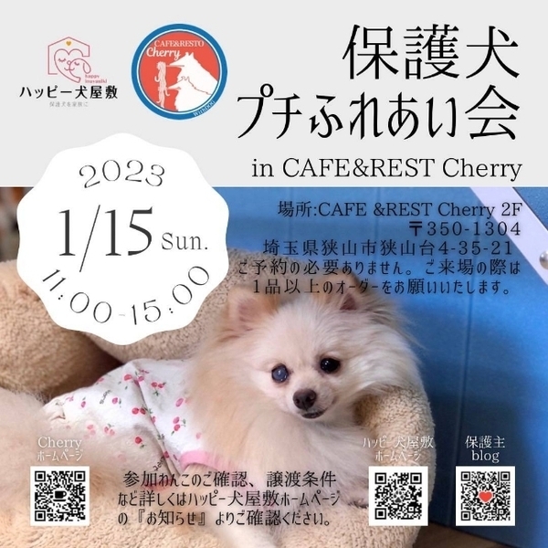 | イベント内容 | 埼玉県狭山市のCAFE&RESTO Chrryの2階スペースをお借りして、プチふれあい会を開催することになりました。 可愛い保護わんこたちに会いに、ぜひお越しくださいませ。 ふれあい会だけでなく、お店でのランチも併せてご利用の場合は予約が可能です。 ランチのご予約はお店に直接お電話のうえお願いいたします。 04-2937-7163 (予約がいっぱいになりしだい締め切らせていただきます) 日時:2023年1月15日(日) 11時00分~15時00分 ※お店の営業時間は11時00分~20時00分(ラストオーダー19時30分となります) 場所:CAFE&RESTO cherry with DOG 埼玉県狭山市狭山台4-35-21 【ご注意とお願い】 ●ご予約は必要ありませんが、ご来場前には必ずハッピー犬屋敷ホームページの里親の条件をお読みいただきますようお願いいたします。 ●混みあっているときは、入場をお待ちいただくことがありますので、あらかじめご承知おきください。 ●お目当ての子がいる場合は、ご自宅の飼育場所、安全対策などの写真を撮ってきていただけるとお話しがスムーズです。 ●プチふれあい会のお問い合わせは、お店ではなくハッピー犬屋敷ホームページのお問い合わせフォームよりお願いいたします。 ●ハンドメイド作品の販売コーナーも設置予定です。お買い物でのご支援もどうぞよろしくお願いいたします。 ●ご来場の際は、お一人1品以上のオーダーをお願いいたします。 ●マスク着用のうえ、ソーシャルディスタンスにご配慮ください。 ●保護犬たちはデリケートです。必ずスタッフの指示に従って触れ合ってください。 ●当日に、わんこを連れて帰ることはできません。 ●ご自宅のわんこをお連れになる場合は、オムツまたはマナーバンドとリードの着用をお願いいたします。 ●新型コロナウイルスの感染状況により、やむを得ず中止になることがありますので、あらかじめご承知おきください。 皆さま、どうぞマナーを守ってのご来場をお願いいたします。 |