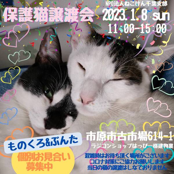 | イベント内容 | 子猫から大人猫まで、沢山の保護猫達が譲渡会に参加します♪ ブログにて、譲渡会に参加する猫さん達を紹介しております。 ねこけん千葉支部ブログ→ https://ameblo.jp/nekoken-chiba/ 通常スタイルの譲渡会と致しますが、コロナウイルス対策として ・会場内ではマスクのご着用と入退室の際は消毒をお願い致します。 ・ご予約無しでお越しいただけますが、混雑時は整理券を配らせていただきます。 ご協力の程よろしくお願い致します。 また、譲渡会会場では、千葉県内にお住いの預かりボランティアさん及びお世話ボランティアさんを募集しています。 ご希望の方は、大変お手数をおかけしますが、譲渡会までお越しください。 ※ご都合がつかない場合は、お問い合わせ先までご相談ください。 [日時] 1月8日(日)11:00~15:00 [会場] 千葉県市原市古市場614-10 ※屋内での開催となり雨天決行です。 ※抱っこもOK! ※猫ちゃんの負担も考え、ご来場は時間内にお願い致します。 ※特にご予約などは必要ございませんのでご家族皆様でぜひお越し下さい。 ※駐車場あり。 [交通] 交通機関を利用してお越しの方 JR内房線 浜野駅より徒歩13分 浜野駅は、東京駅から京葉線→内房線でおよそ50分の距離!! お車でお越しの方 京葉道路蘇我インターより車で10分 ※駐車場はラジコンショップハッピー様裏手にございます駐車場をご利用ください [譲渡ご希望の方へのお願い] 誠に恐れ入りますが下記に当てはまります方への譲渡は不可となりますので予めご了承下さい。 ①学生さん、未成年の方、安定収入のない方 ②ペットを飼う事を許されていない住宅にお住まいの方 ③身体的、精神的疾病で治療中の方 ※60歳以上の方は別途条件がございますのでご相談下さい。 [譲渡の流れ] お申込み→審査→後日お届け→トライアル→正式譲渡 ※当日のお連れ帰りは出来ませんので予めご了承ください。 ※仮譲渡時にご希望の猫ちゃんにかかった医療費(血液検査・ワクチン・駆虫・不妊去勢手術等)をご負担願います。 しかし、正式譲渡に至らなかった場合は医療費を全額返済致します。 [主催] 動物愛護団体 NPO法人ねこけん 千葉支部 [ブログ] https://ameblo.jp/nekoken-chiba/ [参加動物] 成猫・子猫(ねこけん保護猫以外の猫ちゃんも参加予定です) [お問い合わせ] ご不明な点、ご質問等ございましたら下記までお問い合わせください。 chiba.info@nekoken.jp |