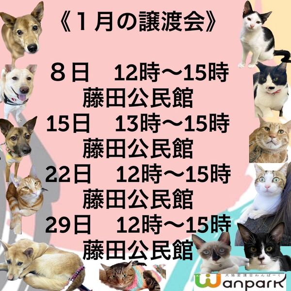 | イベント内容 | 1月15日(日)13-15時、藤田公民館にて犬猫の譲渡会を開催します! ⚠️新型コロナウィルス感染症感染防止対策のため、発熱等、体調不良のある方は来場をお控えください。 来場の際はマスク着用の上、入場前の手指消毒と検温にご協力をお願い致します。 ご希望の子がいましたら、是非事前にホームページからお問い合わせ下さい! (⚠︎会場への直接のお問い合わせはお控えください) 【予約、お問い合わせ、詳細や日常の様子はこちらから↓】 ●HP https://www.wanpark.org/ https://www.instagram.com/wan89.okayama/ https://www.facebook.com/wan89okayama/ 予約優先、1組30分厳守のご案内です。 |