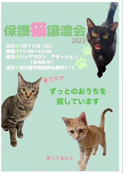 | イベント内容 | 大きな子からちびっこまで 年齢・性格色んな子たちが参加します☆ 保護猫たちを紹介しています sabuntama インスタグラム https://www.instagram.com/sabuntama5/ ☆会場 愛知県名古屋市昭和区丸屋町1-3 ネイルサロン Minetaya ☆13:00~15:00 駐車場は、コインパーキングをご利用下さい。 事前の予約は不要です。 皆さんお待ちしています☆ |