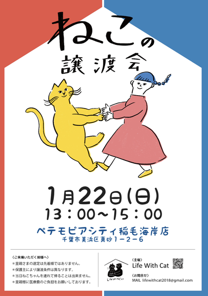 | イベント内容 | 第91回 Life With Cat『ねこの譲渡会』 1月22日(日曜日) 13:00~15:00 <会場> ペテモピアシティ稲毛海岸店 千葉市美浜区真砂1-2-6 ピアシティ稲毛海岸B棟1階 *京葉線稲毛海岸駅から徒歩約10分 *駐車場有り 以下の条件を満たしている方をお待ちしております☺︎ ・子猫の急病に速やかに対応できるお留守番が4〜5時間程度の方 (単独世帯の方に子猫は譲渡しておりません) ・年齢が成人~55歳以下で就労し安定した収入のある方 ・脱走防止対策をしっかり施してくださる方 ---お願い--- コロナウィルスなどの感染予防のため ご来場の際はマスク着用・入り口でのアルコール消毒&検温・会場内ではお客様同士の感覚の確保にご協力頂き 風邪のような症状のある方や体調の悪い方はご来場を見合わせてください。 また基礎疾患のある方のご来場も控えていただいた方が賢明です。 ----------- *里親さまの選定は先着順ではありません。 *保護主により譲渡条件は異なります。 *当日ねこちゃんを連れて帰ることは出来ません。 後日 保護主が里親様宅へお届けいたします。 *里親様に医療費のご負担をお願いしております。 |
