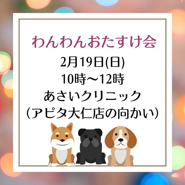 | イベント内容 | 次回のわんわんおたすけ会(譲渡会、バザー)の詳細が決まりました? 2月19日(日)10時から12時まで、あさいクリニック駐車場 をお借りして開催します❣️静岡県伊豆の国市、アピタ大仁店の目の前になります。 ぜひぜひ、気軽にお越しください✨ 主催:犬部わんわんお助け隊 インスタ https://instagram.com/inubu_wanwanotasuketai?igshid=YmMyMTA2M2Y= ブログ https://ameblo.jp/inubu11/ |