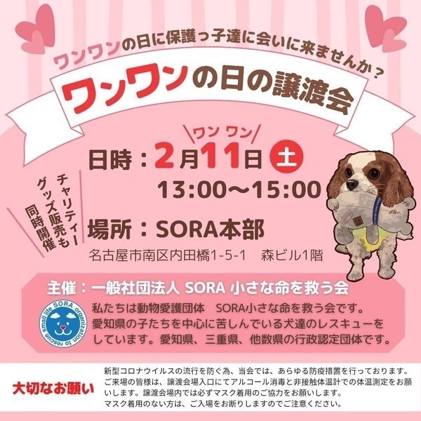 | イベント内容 | わんわんの日に譲渡会を行います。 ぜひ可愛い保護っ子達に会いに来て下さいね。 チャリティグッズ販売も同時に開催します。 |