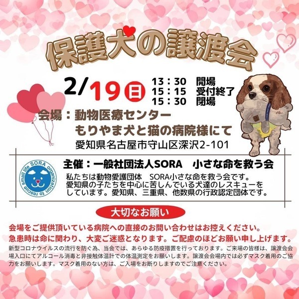 | イベント内容 | 保護犬の譲渡会を開催致します。 【注意】会場をご提供頂いている病院への直接のお問い合わせはお控えください。 急患時は命に関わり、大変ご迷惑となります。 ご配慮のほどお願い申し上げます。 もりやま犬と猫の病院さま 2階会議室 〒463-0811 名古屋市守山区深沢2-101 《ご注意》 家族希望ワンコがいる場合のお見合いに限定させていただきます。 事前のお申込みは不要です。保護活動ブログで、開催日の数日前に譲渡会参加が決定したワンコたちのご案内もしておりますので、ご希望のワンコの参加をご確認してお越し頂けますと幸いです。 なお、新型コロナウィルス感染拡大の状況におきまして、中止させていただくこともございますのでご了承下さい。 SORA公式ホームページ https://sora-chiisana.org/foster/ SORA公式活動メインブログ https://ameblo.jp/sora-chiisana-inochi/ SORAイベントブログ https://ameblo.jp/sora-charity-events/ |