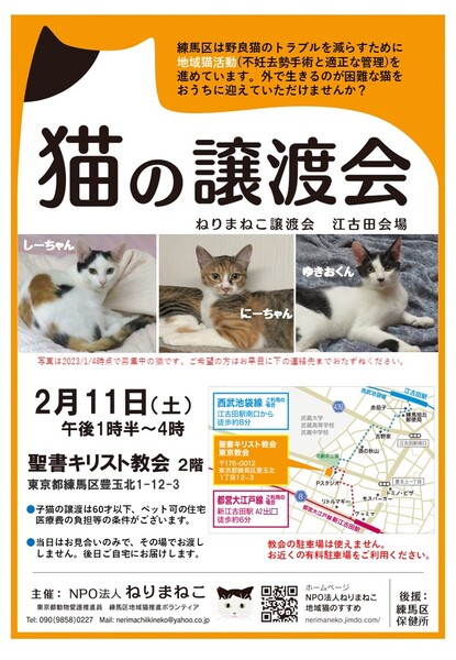 | イベント内容 | 医療・しつけ済のかわいい猫 十数匹が参加予定! 猫を家族に迎え、生活を楽しく豊かにしませんか? 練馬区は猫トラブル軽減のため、地域猫活動を進めています。 その過程で保護した猫たちが参加します。 _______ 主催:NPO法人ねりまねこ、後援:練馬区保健所。 【交通】 西武池袋線 江古田駅 南口 徒歩8分 大江戸線 新江古田駅 北口 徒歩6分 ※ペット可住宅・完全室内飼い・誓約書・子猫は60才以下・医療費の一部負担等の条件があります。 お問い合わせ NPO法人ねりまねこ nerimachiikineko@yahoo.co.jp ブログ:ねりまねこ・地域猫 https://ameblo.jp/nerimaneko/ ホームページ 地域猫のすすめ https://nerimaneko.jimdo.com/ |
