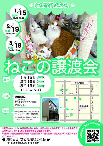 | イベント内容 | 毎月奈良市ならまちにて猫の譲渡会を行っております。 会場には会の保護猫ちゃんたちをはじめ、個人で活動されているボランティアさんが保護した猫や一般の方に保護され里親さんを探している保護猫など、沢山の保護猫たちが里親さんとのご縁を待っています。 また、会場ではチャリティグッズ販売も行っております。 皆さまのお越しをお待ちしております(=^・^=) 参加猫の詳細は https://www.facebook.com/nara.chiiki.neko/ https://www.instagram.com/nara.chiiki.neko/ にて告知します。 ※コロナウイルス感染拡大につきまして、譲渡会の急な変更がある可能性もございます。最新の情報はSNSにてご確認お願いいたします。 |