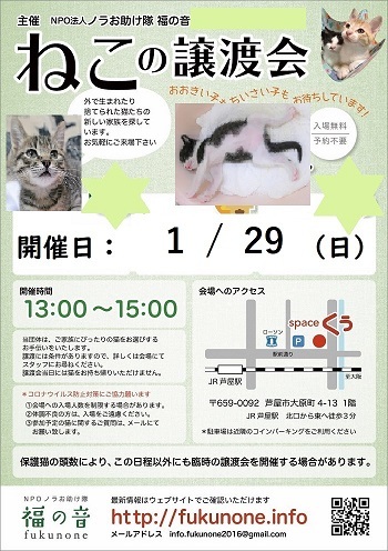 | イベント内容 | 保護された仔猫も大人猫も、新しいお家を求めて参加します(=^・^=) 猫は後日こちらからお届けをさせて頂き、お家の環境を見せて頂ければと思います。 猫は20年くらい生きる子もいますので、ご自身の年齢に合った猫さんとの出会いを探しに来てください。 ペット不可にお住まいの方はご遠慮ください!(ご確認ください) 仔猫の場合は、お留守番が長いお家には難しいですので、ご了承ください。 譲渡には条件がありますので、ご理解くださいませ。 里親希望の方は予約優先ですので、出来れば下記に連絡をください。 ご予約は、アドレス miina0807@y5.dion.ne.jp です。 お越しの際はJR芦屋駅からは徒歩3分、車でお越しの場合は近隣にコインパーキングがあります。 当日、体調の悪い方、発熱がある方、このような方はご遠慮ください。 毎月、最終日曜日に開催予定にしておりますが、変更もありますのでご確認ください。 こちらでは、体温チェックや消毒をし、万全を期しております。 |