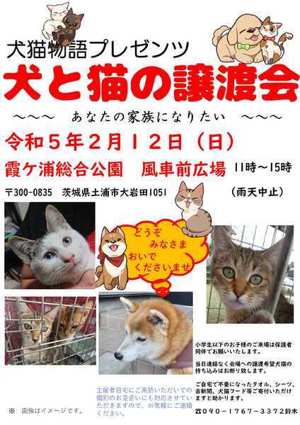 | イベント内容 | 霞ヶ浦総合公園(水郷公園)にての犬と猫の譲渡会です。 あなたとの出会いを待つワンニャンにぜひ会いにきてくださいませ。 11時~15時開催です。 https://jmty.jp/ibaraki/pet-dog/article-ylbh1 こちらで募集中の柴犬のはなちゃんも参加です(^^ 問い合わせは09017673372鈴木まで。非通知には出ません。 |