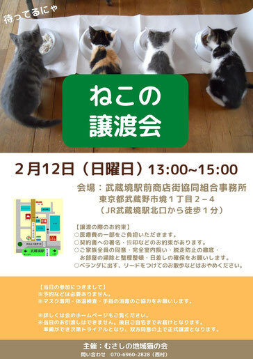 | イベント内容 | 保護っ子達の家族を探しています。 ご予約などはいりませんので、当日時間内にお越しください。 ・マスク着用をお願いします ・検温と手指の消毒にご協力ください ・密にならないようになるべく距離を保っていただくようお願いします ・人数制限をさせていただきますのでお待ちいただくことがあると思いますが、ご理解お願いいたします。 当日、抱っこなどはできません。また、当日連れて帰ることもできません。 里親さんになるまでの手順は、むさしの地域猫の会ホームページをご覧ください。 ~里親さまへのお願い~ ・完全室内飼育をお願いします ・脱走防止策の徹底をお願いします ・綺麗で片付いたお部屋と、日向ぼっこできる場所をご用意ください ・なにがあっても最後のときまで一緒に居てあげてください 猫も人間と同じように歳を取ります。 終生責任をもって愛情を注いでくださる方のお申し込みを希望しています。 |