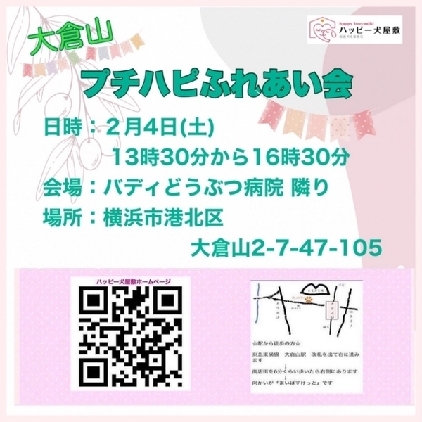| イベント内容 | ご予約は必要ありませんが、ご来場の際の感染対策をお願いいたします。 (短時間の滞在時間となります) また、ワンコをお連れの場合は、紙オムツまたはマナーベルトの着用をお願いいたします。 ※新型コロナウイルスの感染状況により中止になる場合もございます。 しのママ、恋ママ、ぽえママのブログやインスタでご確認のうえご来場くださいませ。 色々とお願いごとばかりですが、よろしくお願いいたします。 日時: 2023年2月4日(土)13時30分から16時30分 場所: バディ動物病院隣り(横浜市港北区大倉山2-7-47(105) ※お越しいただく前に「ハッピー犬屋敷の里親の条件」をお読みいただきますよう、お願いいたします。 プチふれあい会は、預かりママや在校生のわんことじっくり話したり触れ合うことができますよ♪ 横浜方面のみなさま、どうぞ足をお運びくださいませ。 ★参加予定ワンコはハッピー犬屋敷ホームページの下記からご確認くださいませ。 ↓ https://inuyasiki.com/2023/01/%e3%80%90%e6%a8%aa%e6%b5%9c%e6%96%b9%e9%9d%a2%e3%80%91%ef%bc%92%e6%9c%88%e3%83%97%e3%83%81%e3%83%8f%e3%83%94%e3%81%b5%e3%82%8c%e3%81%82%e3%81%84%e4%bc%9a%e9%96%8b%e5%82%ac%e3%81%ae%e3%81%8a%e7%9f%a5/ |