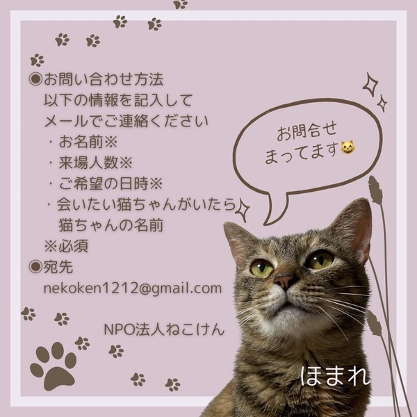 | イベント内容 | 【ねこけん秘密の譲渡会を開催!】 ★完全予約制★ 本気で保護猫を家族に迎えたい方限定です♡ [お見合い可能な日程] 2023年2月 4(土)、11(土)、18(土)、25(土) [お見合い会場] 東京都杉並区のねこけん保護猫シェルター 荻窪駅より 徒歩20分 もしくは バス6分徒歩3分 ※ご応募の猫さんによっては会場が変わる場合がございます。 [予約方法] nekoken1212@gmail.com ↑こちらへメールをお願いします。 ①お名前 ②来場人数 ③ご希望の日時(第3候補くらいまでご提示いただけると助かります) ④会いたい猫さんの名前 日時と会場につきましては、メールにてご案内させていただきます。 ーーーーーーーーーーーーーーーーー ねこけんの譲渡会・イベント情報リストはコチラ? https://satoya-boshu.net/event/?@button_name@=search&Event_MemberID=1288 ーーーーーーーーーーーーーーーーー ◆必ずお守り頂く事◆ ①終生飼養 ②完全室内飼養 ③年1回のご報告 ④ペット飼育可能な物件にお住まいであること ただし、以下の該当の方は、譲渡出来ない場合がございます。 ※学生、安定的な収入のない方 ※60歳以上の方は、成猫さんを家族に迎え入れることが出来ます。 里親様のご年齢に応じた成猫の譲渡となりますのでご相談ください。 ◆譲渡費用について◆ 不妊去勢手術・医療費の一部負担をお願いしております。 お届けエリアによっては往復高速料金(実費)を別途ご負担いただく場合がございます。 なお、交通費に関しましては正式譲渡に至らない場合であってもご返却できませんので予めご了承下さい。 ・ご希望の猫さんと家族になるまでの流れ ・譲渡時にかかる一部ご負担金などの詳細 ・譲渡契約書のサンプル等 下記URLに掲載しておりますのでご確認ください。 https://nekoken.jp/jotokai/joto-nagare/ https://nekoken.jp/jotokai/joutokibou/ ◆引き渡し方法◆ 1週間程度のトライアルの後、正式譲渡となります。 必ずご自宅までお届けします。 ◆お届け可能エリアについて◆ 応募可能エリア内であっても、遠方の場合アフターフォローの関係上お断りさせていただくことがございます。 ご心配な際は、前もって市区町村名や最寄り駅等をメールにてお問い合わせいただけますと幸いです。 お手数をおかけいたしますが、何卒ご了承くださいますようお願いいします。 [連絡先] ご質問等ございましたらお気軽にお問い合わせください。 NPO法人ねこけん東京本部 nekoken1212@gmail.com [ホームページ] https://nekoken.jp [Instagram] https://www.instagram.com/nekoken2222/ [ブログ・ボラ日記・YouTubeなど] https://linktr.ee/nekoken フォロー・チャンネル登録よろしくお願いします! |