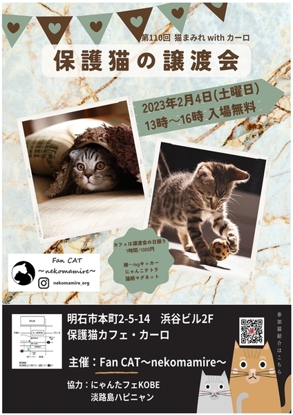 | イベント内容 | 日時:2月4日(土)13時から16時まで 場所:明石市本町2-5-14 浜谷ビル2階 保護猫カフェ・カーロ (お問合せはカーロさんにしないようにお願いします) 子猫が少ない今の時期に4か月くらいのまだ幼い子猫さんが参加しています♪ 本気で猫を飼いたい方是非ご来場ください 早い順ではございませんが早くに決まってしまう場合がございますので お早めにお越しいただくか面会予約をお願いします ※無料ではありません ※当日連れて帰れません ※譲渡条件があります ●参加猫たちのお紹介やお問い合わせ(面会予約等)は ブログよりご連絡お願いします https://mycatkobe.blog.fc2.com/ 主催:Fan CAT~nekomamire~ |