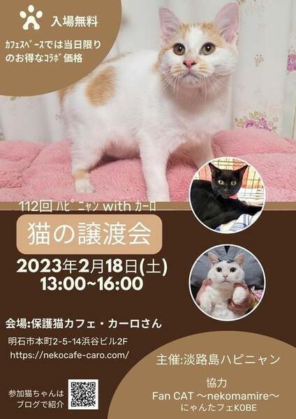 | イベント内容 | 猫の譲渡会 日時:2月18日(土)13時から16時まで 場所:明石市本町2-5-14 浜谷ビル2階 保護猫カフェ・カーロ (お問合せはカーロさんにしないようにお願いします) ★お車の方は近隣にコインパーキングがたくさんありますので ご駐車お願いします 猫ちゃんがたくさん参加しています♪ 今回は長毛の可愛い子猫も新しく参加していますよ! 本気で猫を飼いたい方是非ご来場ください♫ 早い順ではございませんが早くに決まってしまう場合がございますので お早めにお越しいただくか面会予約をお願いします ※無料ではありません ※当日連れて帰れません ※譲渡条件があります ●参加猫たちのお紹介やお問い合わせ(面会予約等)は ブログよりご連絡お願いします https://ameblo.jp/wan--love--nyan/ 主催:ハピニャン |