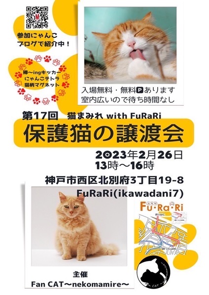 | イベント内容 | 猫の譲渡会 2023年2月26日(日)13時~16時 神戸市西区北別府3丁目19-8 https://goo.gl/maps/Cq15cEHSiWqmYVC8A Fu・Ra・Ri(ikawadani7)無料パーキングあります 今回は長毛子猫さん参加しています! 4か月の子猫や中猫さんたちたくさん参加していますので是非ご参加ください!! 参加の猫ちゃんたちはブログにて掲載しています 参加猫ちゃんイベント情報に写真掲載しています https://mycatkobe.blog.fc2.com/ お見合いしたいと思われる方は、ブログのメールフォームにお越しになる時間をご連絡ください ※譲渡は無料ではございません(譲渡会参加は無料です) ※譲渡条件がございます ※当日連れて帰れません ※※早い順ではございませんがご縁があれば早くに決まってしまう 場合がありますのでお見合いの予約かお早めにご来場ください 主催 Fan CAT~nekomamire~ |
