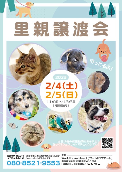 | イベント内容 | ワールドラブハートで里親募集中の動物たちの譲渡会を開催します! 犬・猫・鳥・ウサギなどたくさんの保護動物がいます。みんな新しい家族を探しています。写真だけでは伝えきれない魅力がたくさんあります!実際に会ってそのかわいさを実感してください♪ みんな新しい家族を待っています! どうか、かわいい動物達に会いに来てください。 子犬や子猫もたくさんいますよ♡ ●混雑をさけるために事前予約をお願いします。予約番号080-8521-9553 ショートメールでも可♪ ※当日までに譲渡決定した子や体調不良などで不参加の場合があります。ご希望の子がいましたら当日お問い合わせください。 ※当日、その場での引き渡しはしておりません。譲渡決定後、自宅訪問を兼ねてこちらからお届け致します。 world love heart https://worldloveheart-nara.jimdofree.com |
