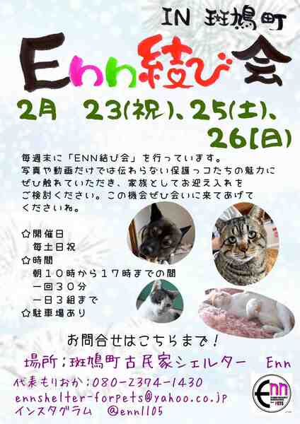 | イベント内容 | Enn結び会を始めます! Ennにはまだまだご紹介しきれていないワンちゃん猫ちゃんがたくさんいます。 そのコたちが全頭、早く良いご縁に恵まれますよう 今後毎週末に「Enn結び会」を行うことにしました。 写真や動画だけでは伝わらない保護っコたちの魅力に ぜひ触れていただき、家族としてお迎え入れをご検討ください。 子犬ちゃんたちも参加! すくすく育って元気いっぱい! イチバン可愛い時期です!! 仔犬の可愛さは 犯罪級♪ お迎え入れご検討中の方 この機会ぜひ会いに来てあげてくださいね。 予約制となっております。 ☆開催日 毎土日祝 ☆時間 朝10時から17時までの間 一回30分 一日3組まで ☆要予約! ☆駐車場あり 【お申込み・お問い合わせ】 ・ennshelter-forpets@yahoo.co.jp まで ・インスタグラム @enn1105 の DM ※事前に飼育環境などのアンケートにお答えいただいた後、 ご来場の日程をお返事させていただきます。 ※譲渡条件がありますので、全てのご応募にお応えできないことが あります事をご了承ください。 |