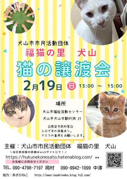 | イベント内容 | 【ココがポイント!】 ★ウイルスチェックなど健康診断済み! 20匹ほど参加予定です。 【日時】 2月19日(日)13~15時 【場所】 犬山市福祉活動センター (犬山市大字犬山字勧行洞25) 予約不要 広々駐車場あり 福猫の里 犬山「福猫の里便り」 https://hukunekonosato.hatenablog.com/ 問い合わせ先(福猫の里 犬山) a-saoka.922@outlook.com 協力 あさひねこ http://owariasahineko.blog.fc2.com/ ーーーーーーーーーーーー 【感染予防対策】 ★入口で検温と手の消毒あり ★マスクの着用をお願いします ★入場制限する場合があります ★猫と猫の間をあけます。 ★保護主との距離も取ります ★定期的に換気をします 【お約束】 当日、会場での猫の引き渡しはしておりません。 後日ご自宅までお届けします。 お試し飼育(トライアル)を1週間して頂き、双方が納得の上で正式譲渡となります。 譲渡の際は、医療費の一部の負担をお願いしております。(ワクチン代 等) ・ペット可のお住まい ・完全室内飼育、終生飼育 ・適切な医療措置 ・不妊手術の実施と報告等、お約束があります。 愛知県犬山市犬山字勧行洞25 イベント会場 |