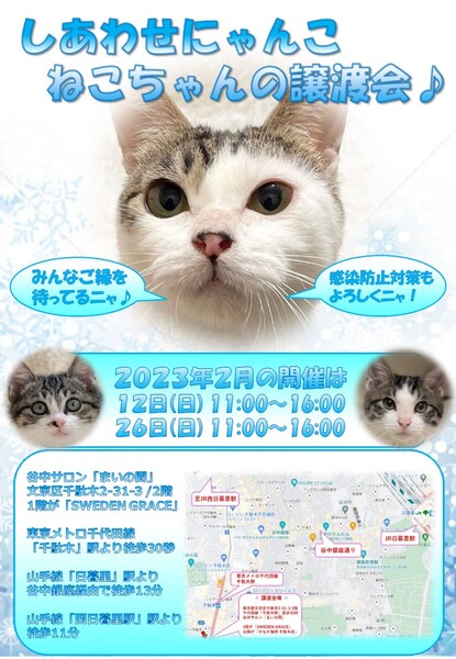 | イベント内容 | 「しあわせにゃんこ」は行き場のない猫ちゃんと里親様との 出逢いの場を提供するグループです♪ 子猫も成猫もハンデのある猫もみんな新しい家族を待っています♪ みなさまのご来場を保護主、スタッフ一同心よりお待ちしております♪ 開催にあたり感染対策として各種制限等を設けております。 ※詳しくはホームページ譲渡会情報をご確認願います。 http://www.shiawasenyanko.net/jyoutokai.html まだまだ寒い日が続いていますがにゃんこが居ればポカポカですよ♪ ◆開催日/開催時間◆ 2023年2月12日(日) 11:00~16:00 感染者数の状況により開催の可否を判断させて頂きます。 ご希望の猫ちゃんがいらっしゃる場合は11時30分までに受付をお願い致します。 複数のお申し込みがある場合は11時30分で受付を終了させて頂く場合がございます。 受付をされた全ての里親様とお見合いをさせて頂きます。 ※先着順ではございません。 ※当日、猫ちゃんを連れて帰ることは出来ません。 後日調整のうえ保護主が里親様宅へお届けいたします。 ◆会場◆ 受付はまいの間1階です♪ 直接会場までお越し下さい♪ 譲渡会場:東京都文京区千駄木2-31-3 1階が北欧雑貨ショップ「SWEDENGRACE」 2階が谷中サロン「まいの間」 ※詳しいアクセスはホームページ案内図をご覧下さい http://www.shiawasenyanko.net/mapmainoma.pdf 谷中サロン「まいの間」の情報はこちら http://neko-to-kyo.com/#maima ◆交通手段◆ 東京メトロ千代田線「千駄木」駅より徒30秒 JR山手線「西日暮里」駅より徒歩11分 JR山手線「日暮里」駅より谷中銀座経由で徒歩13分 ※お車でご来場の際、駐車場のご用意はございません。 近隣のコインパーキング等をご利用ください。※近隣に沢山あります。 いつ里の掲載参加猫一覧はこちらから https://satoya-boshu.net/mypage/foster_list.php?@ps@=none アメーバブログの里親募集にゃんこはこちら https://ameblo.jp/shiawasenyan-ko/theme-10092719565.html ◆猫ちゃんとのお見合い◆ 掲載している猫ちゃんは基本的に譲渡会場でのお見合いのみとなります。 譲渡会への参加が決定している猫ちゃんはその譲渡会で里親様が決定しなかった場合のみ保護主宅でのお見合いが可能となります。 自宅お見合いを希望される里親様はメール(info@shiawasenyanko.net)にてご相談ください。 ◆当譲渡会では猫ちゃんと里親様のスキンシップを大切にしています◆ 新しい家族として20年以上いっしょに暮らしていく猫ちゃんです。 譲渡会場でたくさんの猫ちゃんと触れ合って良きパートナーを見つけてください。 はじめて猫ちゃんを迎える不安や先住猫ちゃんとのトライアルの注意点、猫ちゃんと里親様の暮らし方など気軽にご相談ください。 経験豊富な保護主や猫大好きスタッフがアドバイスさせていただきます。 ◆子猫ご希望の里親様◆ 子猫は急な下痢や発熱等により体調が急変し、数時間対応ができなかっただけでも命を落とす事があります。 その為、当譲渡会では月齢によりお留守番のない又は少ないご家庭への譲渡に限らせて頂いております。 また里親様と子猫ちゃんが安心してトライアル期間を過ごせるよう体重が1㎏程になってからのお届けとさせて頂いております。 ◆里親希望のみなさまへ◆ ご家族の皆様で生涯、家族の一員としてたっぷり愛情を注いでくださるご家庭をお待ちしております。 下記に該当する希望者様へ ・独身、単身者の方 ・友人同士、同棲でのお住まいの方 ・高齢者のみのご家庭の方 は、ご相談の上、譲渡を判断させて頂きます ・適正飼育の不可能な方 ・脱走防止対策を考えて頂けない方 ・定期報告の不可能な方 は、ご遠慮下さいますようお願い致します ◆ご負担頂く費用について◆ 譲渡の際に譲渡負担金(医療費の一部、譲渡金、お届け時の交通費)を里親様にご負担頂く事により 過酷な状況にいる猫ちゃんを保護し新しいご家族の元へ送り出す事ができています。 皆様のご理解とご協力にボランティア一同、心より感謝しております。 ご負担頂く医療費につきましてはホームページに詳しく記載させて頂いております。 http://www.shiawasenyanko.net/onegai.html しあわせにゃんこホームページ http://www.shiawasenyanko.net メールでのお問い合わせ info@shiawasenyanko.net |