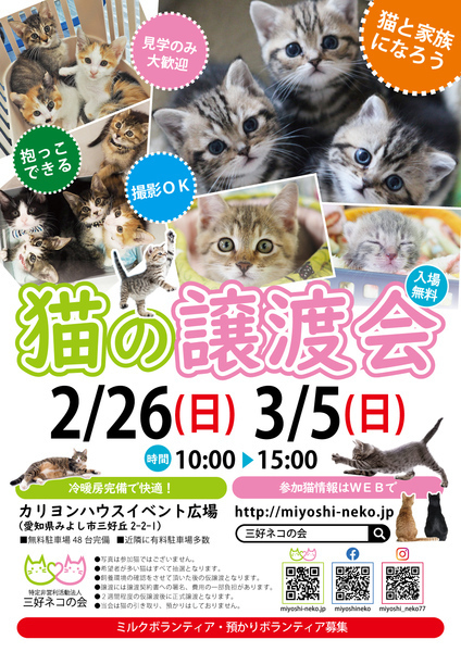 | イベント内容 | 5ヵ月から成猫まで17匹が参加予定 可愛い猫達に会いに来てください。ご来場お待ちしております 抱っこOK!撮影OK!見学のみOK! ↓参加予定猫↓ http://miyoshi-neko.jp/foster_parents.html ※日々更新中、当日参加もあり。 〇◎猫17匹の譲渡会◎〇 2月26日(日)10時~15時 三好ヶ丘カリヨンハウスイベント広場 (愛知県みよし市三好丘2-2-1) *無料駐車場48台、近隣に大型コインPあり <ご来場前にお読みください> 体調不良等で不参加になる猫もございます。 猫は早いもの勝ちではございません。 すべての希望者とお話しをしてトライアル先は抽選で決まります。 当選された方のみ担当者からご連絡を差し上げます。 ++++++++++++++++++++++++++ 【NPO法人三好ネコの会】 http://miyoshi-neko.jp https://www.instagram.com/miyoshi_neko77 ・amazon欲しいものリストから支援お願いします http://miyoshi-neko.jp/fund |