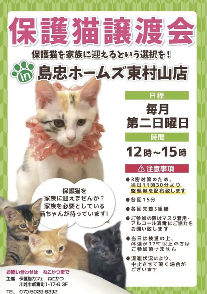 | イベント内容 | 保護猫カフェねこかつさん主催の保護猫譲渡会です? たくさんの猫ちゃんがずっとのおうちを探しています★ 島忠ホームズ東村山店さんでの譲渡会では保護猫応援のためにハンドメイドのお品物が販売されています。 ぜひ遊びに来てください☺︎ |
