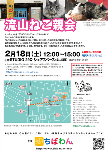 | イベント内容 | 千葉県流山市のSTUDIO 29Q シェアスペースにて、ねこ親会を開催します! 是非かわいい猫たちに会いに来てくださいね♪ 詳細はこちらからどうぞ→https://chibawan.net/event/20230218-nagareyama-cat 【新型コロナウィルス感染予防のため、ちばわんからのお願い】 ①会場内ではマスクの着用をお願いします。 ②入場の際、検温と消毒をお願いします。体温が37.5℃以上の場合、入場をお断りする場合があります。 ③ご予約は不要ですが密を避けるため入場制限をさせていただく場合があります。 2023年2月18日(土)12:00〜15:00 STUDIO 29Q シェアスペース 千葉県流山市平和台4-36-22 流鉄流山線「平和台駅」下車。踏切を渡り200m程直進、左側交差点角。駅より徒歩約3分。 駐車場はございません。当日お車の方は近隣のコインパーキングをご利用ください。 【会場内でのお願い】 ・当日、会場内への犬猫等の愛玩動物の同伴は出来ません。 ・譲渡が決定した場合、後日猫をご自宅へお届けいたします。当日猫をお引渡しすることはございません。 【当日の流れ】 ①ご予約は不要ですが密を避けるため入場制限をさせていただく場合がございます。会場ではちばわんボランティアは名札をつけておりますのでどうぞご遠慮なくお声をおかけください。 また、募集中の猫のそばには預かりボランティアが控えておりますのでご質問ください。 ②気に入った猫がいましたら、該当の預かりボランティアとお話しのうえ、「申し込みアンケート」にご記入ください。 (前日までにインターネットでアンケートを送信してお申し込みいただくこともできます) ◆「ねこ」アンケート送信先:【ねこ親】お申込みアンケート https://chibawan.net/contactform_cat ③アンケート内容を拝見し、アンケート担当者がお話しさせていただきます。 ④原則として一両日中に預かりボランティアからお返事の連絡をさせていただきます。 ⑤ご縁が成立した場合は後日、こちらからご自宅まで猫をお届けし、約1ヶ月のお試し生活に入っていただきます。 お届けの際に書面での譲渡契約書を交わします。 ※ワクチン・去勢不妊手術など保護ねこにかかった費用は家族になるねこ親様にもご負担をお願いしています。 【お願い】 ①ねこ親会・いぬ親会当日の飛び入り参加は受け付けておりません。 犬猫を保護した、飼い主を失った犬猫がいる、新しい家族を探したい犬猫がいるなどの場合は「こんな時どうする?」をお読みください。 ◆こんな時どうする?→https://chibawan.net/help/qacase ②会場は室内ですが、脱走逸走の恐れがあるため、猫はケージから出さないでください。 (ご希望の猫に触れてみたいなどのご希望がございましたらお近くのちばわんボランティアにお声をおかけください) ③参加する猫の中には臆病な性格の子がいます。お子様だけでの入場はご遠慮いただきます。お怪我防止のためにご理解ください。 今後も問題なくねこ親会を続けられるよう皆様のご協力をお願いいたします。 |