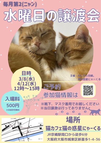 | イベント内容 | 毎月第2(ニャン)水曜日は【水曜日の譲渡会!】 大阪京橋の駅から徒歩6分の猫カフェでねこの譲渡会を毎月のんびり開いています。 10匹以上の猫が参加予定です☆ 人数制限していますので、ゆったり猫さんを見ていただけます。 場所:猫カフェ 猫の惑星にゃーくる (大阪府大阪市城東区新喜多1-4-36) 時間:12時~15時 入場料:1人500円(未就学児は無料) 主催:ねこから目線。 猫の惑星にゃーくる ホームページに参加猫や詳細を記載しております。 https://www.nyacle.com/joutokai Twitter、Instagram各種SNSでも情報発信中です! 猫の惑星にゃーくると検索してください。 お問い合わせ、ご予約は公式LINEからどうぞ! https://lin.ee/QvoeCQI —————– ※マスク、靴下着用です。 ※駐車場はございません。近くのパーキングをご利用ください。 ※当日の猫を連れて帰ることはできません。 |