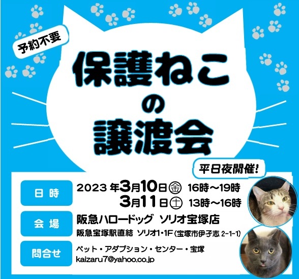 | イベント内容 | 土日は中々予定を空けられないという方に朗報です! 当会で初の平日の夜に譲渡会を開催します。 お仕事帰りや、夕飯のお買い物のついでに、 ぜひお立ち寄り下さい。 保護猫の譲渡会 in 宝塚 https://ameblo.jp/takarazuka-tnr/entry-12788607753.html 【日時】2023年 3月10日(金) 16時~19時 3月11日(土) 13時~16時 (最終受付は、各日とも終了時間の20分前です) 【場所】 阪急ハロードッグ・ソリオ宝塚店内 阪急宝塚駅直結 ・ JR宝塚駅徒歩2分 兵庫県宝塚市栄町1-1 ソリオ宝塚Ⅰ-1F 【予約不要】 直接会場へお越し下さい。 【ご注意事項】 必ずご一読下さい。 ※ 譲渡は先着順ではありません! 2日間ですべての方の見学が終わってから 猫達にいちばん合う里親様を決定させて頂きます。 ※新型コロナウィルス感染予防の為、 入場制限を致します。順番までお待ち頂く事をご了承下さい。 ※入場の際にはマスクの着用、アルコール消毒にご協力ください。 ※当日、猫を連れて帰る事はできません。 里親様になって頂くことが決まりましたら、 後日ご自宅までお連れします。 ※里親のご希望をお断りする事もありますので ご了承お願いいたします。 【主催】 特定非営利活動法人 TNR宝塚 ペット・アダプション・センター宝塚 【協力】 阪急ハロードッグ ソリオ宝塚店 【後援】 宝塚市 【問合せ】 kaizaru7★yahoo.co.jp(★を@に変えて下さい) |