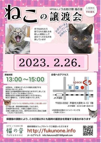 | イベント内容 | 保護された猫が、新しいお家を求めて参加します(=^・^=) 猫は後日こちらからお届けをさせて頂き、お家の環境を見せて頂ければと思います。 猫は20年くらい生きる子もいますので、ご自身の年齢に合った猫さんとの出会いを探しに来てください。 ペット不可にお住まいの方はご遠慮ください!(ご確認ください) 仔猫の場合は、お留守番が長いお家には難しいですので、ご了承ください。 譲渡には条件がありますので、ご理解くださいませ。 お越しの際はJR芦屋駅からは徒歩3分、車でお越しの場合は近隣にコインパーキングがあります。 当日、体調の悪い方、発熱がある方、このような方はご遠慮ください。 毎月、最終日曜日に開催予定にしておりますが、変更もありますのでご確認ください。 こちらでは、体温チェックや消毒をし、万全を期しております。 |