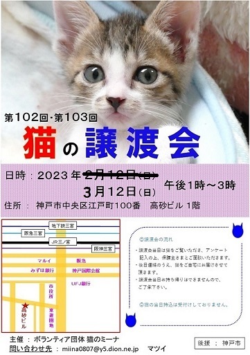 | イベント内容 | たくさんの猫たちが参加予定です。 保護された猫たちが参加して、新しいお家を求めて参加します(=^・^=) 猫は後日こちらからお届けをさせて頂き、お家の環境を見せて頂ければと思います。 猫は20年くらい生きる子もいますので、ご自身の年齢に合った猫さんとの出会いを探しに来てください。 ペット不可にお住まいの方はご遠慮ください! 譲渡には条件が多数ありますので、ご理解くださいませ<m(__)m>。 まずはお試しで猫との相性を見てから、正式譲渡となります。 また、猫を参加させたい方も、募集していますのでお申し込みくださいね! アドレス miina0807@y5.dion.ne.jp にご連絡をください。 お越しの際は各路線の三宮駅からは徒歩10分くらい、車でお越しの場合は近隣のコインパーキングなどにお停めください。 当日、体調の悪い方、発熱がある方、このような方はご遠慮ください。 こちらでは、体温チェックや消毒をし、万全を期しております。 密にならないように、人数制限をしておりますので、お待ち頂く場合があります。 ブログ: 猫のミーナといっしょ http://miina300.blog.fc2.com/ ねこのオカン https://ameblo.jp/miina300/ |