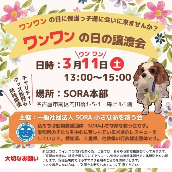 | イベント内容 | わんわんの日に譲渡会を行います。 ぜひ可愛い保護っ子達に会いに来て下さいね。 チャリティグッズ販売も同時に開催します。 |