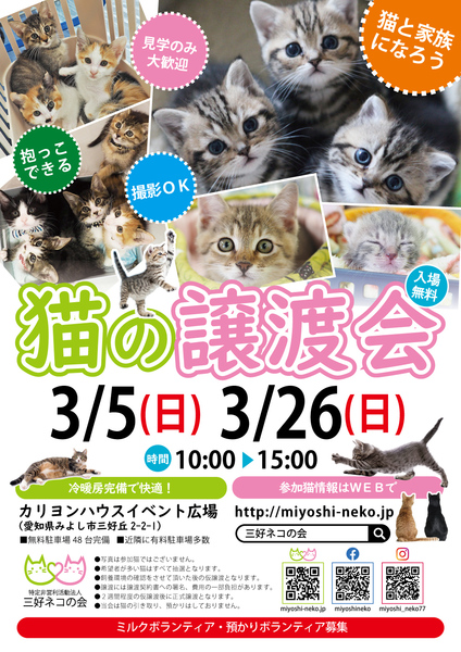 | イベント内容 | 中サイズ、でっかい猫など全部で15匹参加予定♪ 人懐っこい!穏やか!飼いやすい!病気に強い! 大きい猫はメリットがたくさんあります。 抱っこして是非確かめてください!! ↓参加予定猫↓ http://miyoshi-neko.jp/foster_parents.html ※お詫び 参加予定だった2ヵ月の子猫「まる君」は諸事情により不参加となりました。 ◎ネコと家族になろう◎ 3月5日(日)10時~15時 三好ヶ丘カリヨンハウスイベント広場 (愛知県みよし市三好丘2-2-1) *無料駐車場48台、近隣に大型コインPあり <ご来場前にお読みください> 体調不良等で不参加になる猫もございます。 猫は早いもの勝ちではございません。 すべての希望者とお話しをしてトライアル先は抽選で決まります。 当選された方のみ担当者からご連絡を差し上げます。 ++++++++++++++++++++++++++ 【NPO法人三好ネコの会】 http://miyoshi-neko.jp https://www.instagram.com/miyoshi_neko77 ★☆当日はカリヨンマルシェとコラボ☆★ https://www.instagram.com/miyoshi_kariyon_marche/ |