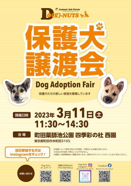 | イベント内容 | 町田薬師池公園 四季彩の杜 西園様にて犬の譲渡会を開催いたします。 動物愛護指導センターに収容されていた中型雑種犬がメイン参加となります。 |