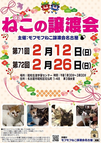 | イベント内容 | モフモフねこ譲渡会名古屋 猫たちの幸せなお家探しのために譲渡会を開催しております。 個人ボランティアの集まりです。 自分たちの出来ることから頑張っております! 一匹でも幸せになれる猫が増えますように 場所 昭和生涯学習センター 3階 第3集会室 住所 名古屋市昭和区石仏町1-48 時間 13時30分~15時30分 交通機関等 地下鉄鶴舞線及び桜通線「御器所」下車2番出口南約300m 3番出口南東約300m 駐車場24台(満車の場合は近隣コインPをご利用ください) 参加猫の情報は下記モフモフねこ譲渡会名古屋ブログにてご確認ください。 https://mofumofuneko4.fc2.net/ 新型コロナウイルス対策として ・会場は換気を定期的に行います。 ・密を避けるため、入場制限をさせていただきます。 ・入口にて手指の消毒、検温をお願いいたします。 ・ご来場の際はマスク着用をお願いいたします。 ・咳・発熱・倦怠感等の体調のすぐれない方はご来場を控えていただきますよう、お願いいたします。 ・新型コロナウイルスの影響により急遽中止になる場合もありますので、モフモフねこ譲渡会名古屋ブログにてご確認の上、ご来場ください。 【譲渡会について】 ・譲渡会は入場無料、予約不要です。お気軽にご参加ください。 ・会場へのお問い合わせはご遠慮ください。 ご質問は下記メールアドレスへお願いいたします。 mofumofuneko4☆gmail.com ☆を@に変更してお問い合わせください。 ・猫の引き取りはしておりません。 ・譲渡会当日に猫をお渡しすることはありません。 ・保護主によって譲渡条件が違う場合があります。 ・参加予定でも譲渡会前にトライアルになる場合があります。 ご希望の猫がいましたらまずはお問い合わせをお願いいたします。 【参加猫について】 ・ノミ駆除、駆虫、トイレ躾、ワクチン3種接種済。 ・年齢や健康状態に応じて、避妊手術を行っております。 ・参加予定で紹介していても当日体調不良等で欠席になる場合があります。 【譲渡の約束事】 ・ペット飼育可の住宅にお住まいの方。 ・完全室内飼育。 ・脱走防止の対策をしていただける方。 ・避妊手術未実施の場合、避妊手術 の実施と報告をしていただける方。 ・ご家族全員が猫を飼うことに同意していること。 ・譲渡後、しばらく定期連絡を入れていただける方。 *お一人暮らしの方、60歳以上の方は、身内の方の保証が必要となる場合がございます。 #名古屋昭和区 #昭和生涯学習センター #譲渡会 #保護猫 #地域猫 #さくらねこ #tnr #里親募集 #里親募集中 #猫 #ねこ #殺処分ゼロ #買わずに飼おう #モフモフねこ譲渡会名古屋 #ペットショップに行く前に #譲渡会のお知らせ #猫と暮らしたい |