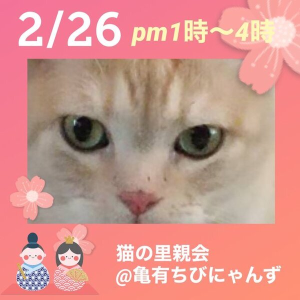 | イベント内容 | 性格がわかっている大人の猫さんの譲渡会です。大人でも、とても愛らしい、生きる力みなぎる猫さんたちです 外で生まれた子、遺棄された子、外で暮らしている猫達が皆あたたかな手を必要としています。そんな猫達を保護して家庭の中で育てています。 その子の個性を良く理解し確実なご縁を繋ぐ為、多くの猫達を保護する事は出来ませんが大切な出会いを探しています。お迎えする方の環境や生活スタイルに適した猫さんをご紹介できますので、どういう猫がいいのかと迷っている方へのご相談も受けています。どうそお気軽にいらしてみて下さい。 【猫の里親会@亀有ちびにゃんず】 2月26日(日) 東京葛飾区亀有3-21-12 カルチャースペースあい 室内開催 13:00 ~ 16:00 手の消毒剤、検温機あり マスク着用、 体調のすぐれない方は見学をご遠慮下さい。 生涯家族の一員としてたっぷり愛情を注いでくださるご家庭をお待ちしております。 ご状況によりご希望に添えない場合もございますのでご了承下さい。 【以下の方には譲渡しておりません】 ・猫の飼育が許可されていない住居にお住まいの方 ・未成年者、友人同士&同棲でお住まいの方 ・乳児のいるご家庭、妊娠中の方 ・お引越し予定の方 ・60歳以上の方への子猫譲渡 ・脱走防止対策にご協力頂けない方 ・経済的に不安定な方(休職中、就職活動中、アルバイト、生活保護等) ・仔猫の場合は留守番の長いご家庭 ・住居の構造を聞かせていただく事があります。(階下への騒音など) ・犬猫を4頭以上飼育している方 他、飼育に適切でないと判断した場合や個体により条件が違う場合があります。 【当里親会は猫さんと里親様とのマッチングを大切にしています】 はじめて猫さんをお迎えする場合に適した猫さん、お留守番の長い里親さんに適した猫さん等、お迎えする不安など経験豊富なスタッフがお話を聞き、アドバイスさせていただいています。 お気軽にお声をかけてください。 【ご負担頂く費用について】 譲渡の際に活動協力金を里親様にご負担頂く事により飼い主のいない猫の継続的治療や保護、新しいご家族の元へ送り出す事ができます。 ご理解とご協力をお願い致します。 ◆活動協力金(譲渡費用)のご負担がございます。 ★仔猫 1頭20.000 ★成猫 1頭25.000 ★成猫(マイクロチップ挿入済み)1頭30.000 全ての猫はワクチン・ウイルスチェック・駆虫が済んでいます。 生後6ヶ月以降~成猫は不妊去勢手術済が済んでいます。 ★猫をお届けする時の交通費をいただいております。1500〜実費 【譲渡の条件がございます】 ①終生飼育 ②完全室内飼育 ③未手術子猫は適正時期の不妊・去勢手術 ④譲渡負担金 ⑤身分証提示&契約書の署名捺印 ⑥定期報告義務(トライアル中こまめに、譲渡後1.3.6ケ月、1年に一度 ⑦二次譲渡の禁止 以上をご了承ください。 トライアル期間は全ての猫さんに設けております。 トライアル期間を経て初めて正式譲渡となります /////////////////////////////////////// https://twitter.com/shosukereiko 【里親さん募集中の猫~猫の里親をさがす会別館】 http://behappynyans.blog.fc2.com/blog-entry-13.html 【猫の里親をさがす会】 https://blog.goo.ne.jp/bobton |