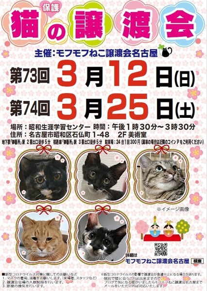 | イベント内容 | モフモフねこ譲渡会名古屋 猫たちの幸せなお家探しのために譲渡会を開催しております。 個人ボランティアの集まりです。 自分たちの出来ることから頑張っております! 一匹でも幸せになれる猫が増えますように 場所 昭和生涯学習センター 2階 美術室 住所 名古屋市昭和区石仏町1-48 時間 13時30分~15時30分 交通機関等 地下鉄鶴舞線及び桜通線「御器所」下車2番出口南約300m 3番出口南東約300m 駐車場24台(満車の場合は近隣コインPをご利用ください) 参加猫の情報は下記モフモフねこ譲渡会名古屋ブログにてご確認ください。 https://mofumofuneko4.fc2.net/ 新型コロナウイルス対策として ・会場は換気を定期的に行います。 ・密を避けるため、入場制限をさせていただきます。 ・入口にて手指の消毒、検温をお願いいたします。 ・ご来場の際はマスク着用をお願いいたします。 ・咳・発熱・倦怠感等の体調のすぐれない方はご来場を控えていただきますよう、お願いいたします。 ・新型コロナウイルスの影響により急遽中止になる場合もありますので、モフモフねこ譲渡会名古屋ブログにてご確認の上、ご来場ください。 【譲渡会について】 ・譲渡会は入場無料、予約不要です。お気軽にご参加ください。 ・会場へのお問い合わせはご遠慮ください。 ご質問は下記メールアドレスへお願いいたします。 mofumofuneko4☆gmail.com ☆を@に変更してお問い合わせください。 ・猫の引き取りはしておりません。 ・譲渡会当日に猫をお渡しすることはありません。 ・保護主によって譲渡条件が違う場合があります。 ・参加予定でも譲渡会前にトライアルになる場合があります。 ご希望の猫がいましたらまずはお問い合わせをお願いいたします。 【参加猫について】 ・ノミ駆除、駆虫、トイレ躾、ワクチン3種接種済。 ・年齢や健康状態に応じて、避妊手術を行っております。 ・参加予定で紹介していても当日体調不良等で欠席になる場合があります。 【譲渡の約束事】 ・ペット飼育可の住宅にお住まいの方。 ・完全室内飼育。 ・脱走防止の対策をしていただける方。 ・避妊手術未実施の場合、避妊手術 の実施と報告をしていただける方。 ・ご家族全員が猫を飼うことに同意していること。 ・譲渡後、しばらく定期連絡を入れていただける方。 *お一人暮らしの方、60歳以上の方は、身内の方の保証が必要となる場合がございます。 #名古屋昭和区 #昭和生涯学習センター #譲渡会 #保護猫 #地域猫 #さくらねこ #tnr #里親募集 #里親募集中 #猫 #ねこ #殺処分ゼロ #買わずに飼おう #モフモフねこ譲渡会名古屋 #ペットショップに行く前に #譲渡会のお知らせ #猫と暮らしたい |