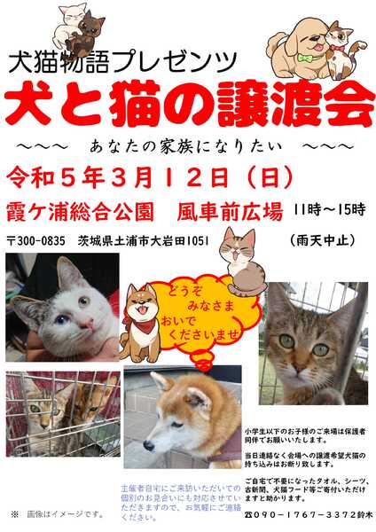 | イベント内容 | 霞ヶ浦総合公園(水郷公園)にての犬と猫の譲渡会です。 あなたとの出会いを待つワンニャンにぜひ会いにきてくださいませ。 11時~15時開催です。 ●犬猫物語は土浦を中心とし保護活動、野良猫の避妊去勢などを行っている団体です。 犬猫の相談などはお電話くださいませ。 譲渡会への猫の参加も受け付けております。 当日いきなりの参加は不可能ですが、事前にご連絡ください。 お待ちしています(^^ 問い合わせは09017673372鈴木まで。非通知には出ません。 |