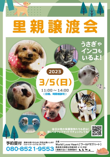 | イベント内容 | ワールドラブハートで里親募集中の動物たちの譲渡会を開催します! 犬・猫・鳥・ウサギなどたくさんの保護動物がいます。 みんな新しい家族を探しています。 写真だけでは伝えきれない魅力が盛りだくさん! 実際に会ってそのかわいさを実感してください♪ 子犬や子猫もたくさんいますよ♡ ●混雑をさけるために、事前予約をお願いします。 予約番号080-8521-9553 ショートメールでも可♪ ※当日までに譲渡が決定した・体調がすぐれないなど、やむを得ない理由で不参加の場合があります。ご希望の子がいましたら、当日お問い合わせください。 ※当日、その場での引き渡しはしておりません。譲渡決定後、自宅訪問を兼ねてこちらからお届け致します。 ご来場お待ちしております♪ world love heart https://worldloveheart-nara.jimdofree.com |