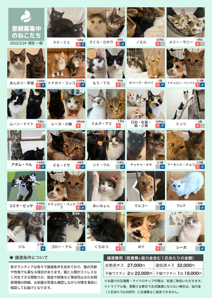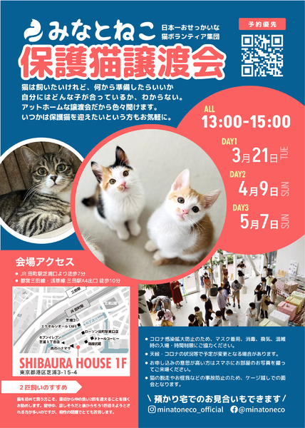 | イベント内容 | 2022年も270匹もの猫と里親さんのご縁を繋いだ毎月定期開催している譲渡会です。 ご予約はみなとねこのHPよりお願いします http://www.minatoneco.com 参加猫の詳細はこちら https://www.minatoneco.com/gallery 参加猫たちの様子はYoutubeのみなとねこチャンネルもご覧ください https://youtube.com/playlist?list=PLRxhCqU-Dt77IaUtZCDeratPPI7Jek6ZL ーーー 会場は明るく開放的な雰囲気です Youtube「みなとねこ譲渡会に行ってみよう」 https://youtu.be/8Q4Gti1swQk 25ケージ 50匹ほどの参加となりますが、それ以外の預かり宅の猫もご紹介可能です。 子猫は2匹ペアでの譲渡が原則です。 初めての方こそ最初から2匹をお勧めしています。 また私たちボランティアはご縁のあった猫たちに終生里親様に愛されて幸せに安全に暮らして欲しいと願っています。 このため里親になっていただくにはいくつかの条件やお約束事があります。 ■里親申込 事前誓約書 adobe.ly/35jdcb2 会場では申込書とお部屋のお写真を拝見してお迎えまでにご準備いただきたいことなどご説明します。 ■里親申込書 adobe.ly/2HqP1iI 会場にてご記入いただくことも可能ですが、お手元で印刷可能でしたら、ご記入の上ご来場いただくことをおすすめしております。 ※事前誓約書の3と4に該当がある方は是非事前にご相談ください。 また猫それぞれの月齢や保護主の考えにより、譲渡条件が加わる場合があります。 実際の参加予定猫は3/20(月)21:00までにみなとねこのHPやFacebookページでご紹介します。 https://m.facebook.com/minatoneco/ 直接ご応募の方は詳細をLINEなどでやりとりの上で預かり宅でのお見合いも行っております。 そうした中で譲渡会前に里親様が決定することもございますことご了承ください。 ※新型コロナの感染拡大防止の観点から予約優先、混雑時は入場をお待ちいただいたり、マスクの着用と消毒のご協力をお願いしております。 ※換気のためにドアをオープンしての開催のためにケージ越しでのご対面となりますことご理解ください。 ※譲渡会の開催や保護活動の継続のため、お一人様500円以上のご寄付をお願いしております。 |
