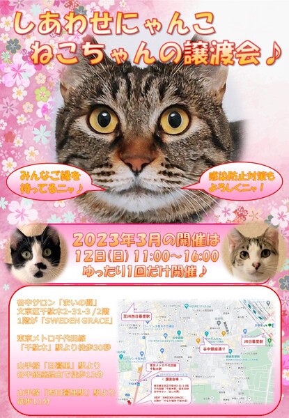| イベント内容 | 「しあわせにゃんこ」は行き場のない猫ちゃんと里親様との 出逢いの場を提供するグループです♪ 子猫も成猫もハンデのある猫もみんな新しい家族を待っています♪ みなさまのご来場を保護主、スタッフ一同心よりお待ちしております♪ 開催にあたり感染対策として各種制限等を設けております。 ※詳しくはホームページ譲渡会情報をご確認願います。 http://www.shiawasenyanko.net/jyoutokai.html 春の到来を感じさせる今日この頃♪ にゃんこと一緒なら楽しさ倍増ですよ♪ ◆開催日/開催時間◆ 2023年3月12日(日) 11:00~16:00 感染者数の状況により開催の可否を判断させて頂きます。 ご希望の猫ちゃんがいらっしゃる場合は11時30分までに受付をお願い致します。 複数のお申し込みがある場合は11時30分で受付を終了させて頂く場合がございます。 受付をされた全ての里親様とお見合いをさせて頂きます。 ※先着順ではございません。 ※当日、猫ちゃんを連れて帰ることは出来ません。 後日調整のうえ保護主が里親様宅へお届けいたします。 ◆会場◆ 受付はまいの間1階です♪ 直接会場までお越し下さい♪ 譲渡会場:東京都文京区千駄木2-31-3 1階が北欧雑貨ショップ「SWEDENGRACE」 2階が谷中サロン「まいの間」 ※詳しいアクセスはホームページ案内図をご覧下さい http://www.shiawasenyanko.net/mapmainoma.pdf 谷中サロン「まいの間」の情報はこちら http://neko-to-kyo.com/#maima ◆交通手段◆ 東京メトロ千代田線「千駄木」駅より徒30秒 JR山手線「西日暮里」駅より徒歩11分 JR山手線「日暮里」駅より谷中銀座経由で徒歩13分 ※お車でご来場の際、駐車場のご用意はございません。 近隣のコインパーキング等をご利用ください。※近隣に沢山あります。 いつ里の掲載参加猫一覧はこちらから https://satoya-boshu.net/mypage/foster_list.php?@ps@=none アメーバブログの里親募集にゃんこはこちら https://ameblo.jp/shiawasenyan-ko/theme-10092719565.html ◆猫ちゃんとのお見合い◆ 掲載している猫ちゃんは基本的に譲渡会場でのお見合いのみとなります。 譲渡会への参加が決定している猫ちゃんはその譲渡会で里親様が決定しなかった場合のみ保護主宅でのお見合いが可能となります。 自宅お見合いを希望される里親様はメール(info@shiawasenyanko.net)にてご相談ください。 ◆当譲渡会では猫ちゃんと里親様のスキンシップを大切にしています◆ 新しい家族として20年以上いっしょに暮らしていく猫ちゃんです。 譲渡会場でたくさんの猫ちゃんと触れ合って良きパートナーを見つけてください。 はじめて猫ちゃんを迎える不安や先住猫ちゃんとのトライアルの注意点、猫ちゃんと里親様の暮らし方など気軽にご相談ください。 経験豊富な保護主や猫大好きスタッフがアドバイスさせていただきます。 ◆子猫ご希望の里親様◆ 子猫は急な下痢や発熱等により体調が急変し、数時間対応ができなかっただけでも命を落とす事があります。 その為、当譲渡会では月齢によりお留守番のない又は少ないご家庭への譲渡に限らせて頂いております。 また里親様と子猫ちゃんが安心してトライアル期間を過ごせるよう体重が1㎏程になってからのお届けとさせて頂いております。 ◆里親希望のみなさまへ◆ ご家族の皆様で生涯、家族の一員としてたっぷり愛情を注いでくださるご家庭をお待ちしております。 下記に該当する希望者様へ ・独身、単身者の方 ・友人同士、同棲でのお住まいの方 ・高齢者のみのご家庭の方 は、ご相談の上、譲渡を判断させて頂きます ・適正飼育の不可能な方 ・脱走防止対策を考えて頂けない方 ・定期報告の不可能な方 は、ご遠慮下さいますようお願い致します ◆ご負担頂く費用について◆ 譲渡の際に譲渡負担金(医療費の一部、譲渡金、お届け時の交通費)を里親様にご負担頂く事により 過酷な状況にいる猫ちゃんを保護し新しいご家族の元へ送り出す事ができています。 皆様のご理解とご協力にボランティア一同、心より感謝しております。 ご負担頂く医療費につきましてはホームページに詳しく記載させて頂いております。 http://www.shiawasenyanko.net/onegai.html しあわせにゃんこホームページ http://www.shiawasenyanko.net メールでのお問い合わせ info@shiawasenyanko.net |