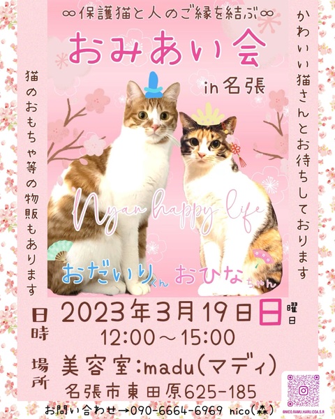 | イベント内容 | 猫と人を繋ぐお見合い会です♡ 1歳未満の子から大人猫さんまでご縁を待っている子がたくさんいます。出来れば仲良し兄弟は一緒に迎えてくださる方、環境に応じた子を迎えてくださる方とのご縁をお待ちしております! |
