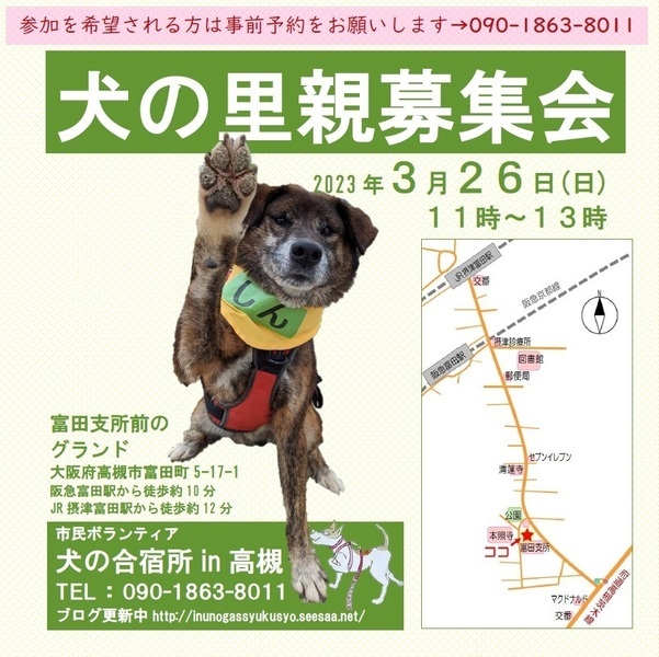 | イベント内容 | 屋外会場での里親募集会です。 ※先住ワンちゃんを連れて会いに来て頂けます。相性を見るためにも、是非是非、連れてきてください。 ※近づきましたら「犬の合宿所in高槻」のブログで里親募集会情報や参加犬情報を紹介していきます。 → http://inunogassyukusyo.seesaa.net/ ※新型コロナウイルス感染予防対策として、予約制にさせて頂きます。 ご来場予定の方は事前にご連絡ください。 【予約・問合せ】 090-1863-8011 ・・・・・・・・・・ 【アクセス】 ・阪急京都線 富田駅から徒歩約10分 ・JR京都線 摂津富田駅から徒歩約12分 ※会場の広場の中に駐車して頂けますので、車で来場される方は事前にご連絡ください。 隣接する富田支所と公民館の駐車場は使えません。 ・・・・・・・・・・ 市民ボランティア「犬の合宿所in高槻」は、殺処分数の多い地方の保健所収容犬を引き取り、関西で新しい飼い主探しをしています。 保護犬を飼うことが文化として定着することで生体販売に伴う悲惨な繁殖犬の存在がなくなることと、 地方の収容犬を人口の多い地域で引き受けることで全体として処分数が減ることを目指しています。 ・・・・・・・・・・・・・・・・・・・・・・・・・・・・・ ★ 一時預かりさんや犬の搬送ボランティアさん、里親募集会の当日お手伝いの方など常時募集しています。 ★犬によっては個別お見合いできる場合があります。 里親募集会に参加できない方で個別お見合いをご希望の方は、預かりさんとの日程調整が必要ですので、電話でお問合せください。⇒090-1863-8011 |