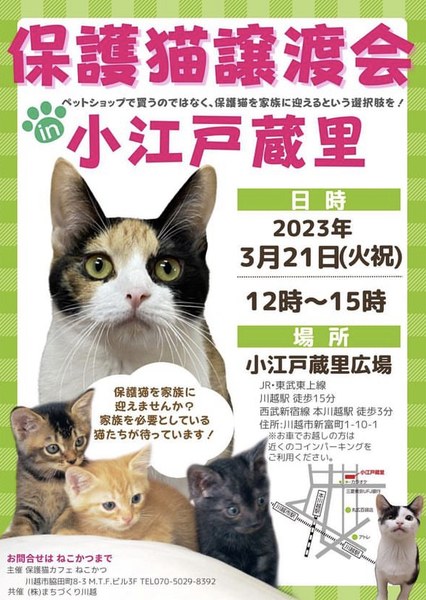 | イベント内容 | 川越市産業観光館小江戸蔵里様で3年ぶりの保護譲渡となります? 保護猫カフェねこかつさんや個人ボランティアさんの猫ちゃんが多数参加予定です☆*:.。 皆様ぜひお立ち寄りください☺︎ ◆JR川越駅 徒歩15分 西武新宿線本川越駅 徒歩3分 ◆お車でお越しの方はお近くのコインパーキングをご利用ください |
