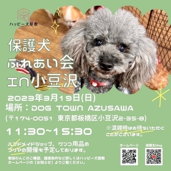 | イベント内容 | ドッグタウン小豆沢で開催のふれあい会のご案内です! ご来場者様が多数の場合は、少しお待ちいただくことがございますので、あらかじめご承知おきくださいませ。 早い時間帯は混みあいますので、比較的遅い時間のほうがゆっくりワンコと触れ合っていただけます。 混雑防止にご協力をよろしくお願いいたします。 ※事前にホームページよりお見合いのお申込みをいただいている方は、優先的にご入場いただけます。 会場でスタッフにお見合いの予定をお伝えくださいませ。 当日はハンドメイドショップ、ワンコ用品のフリマの開催も予定しています。 お買い物のみのご来場もお待ちしております! 日程:2023年3月19日(日) 時間:11時30分~15時30分 場所:ドッグタウン小豆沢(東京都板橋区小豆沢2-35-8) 【ご注意とお願い】 ※保護わんこ達はデリケートです。必ずスタッフの指示に従ってふれあって下さい。 ※現在マスク着用の義務はありませんが、場所柄混雑も考えらえますので、ご入場の際はマスク着用のご協力をお願い致します。 ※当日参加わんこを連れて帰ることは出来ません。 ※わんこのお申し込みは、ふれあい会ご来場後にホームページにあります【里親になる条件】を先にお読みになってからお願い致します。 ※お家のわんちゃんをお連れの時は、あらかじめオムツ又はマナーベルトとリードの着用をした状態でご入場をお願い致します。 ※わんちゃんのサイズ、吠えや攻撃性がある場合は入場をお断りさせて頂きますので、あらかじめご了承下さい。 ※新型コロナウイルスの感染状況により、中止や参加方法が変更する場合がございます。 ハッピー犬屋敷ホームページの「お知らせ」でご確認の上ご来場下さい。 ★皆さま、どうぞマナーを守ってのご来場をお願いいたします。 沢山の方のご来場を、スタッフ一同と可愛い保護わんこ達と一緒にお待ちしています! |
