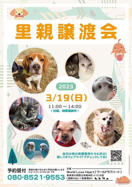 | イベント内容 | ワールドラブハートで里親募集中の動物たちの譲渡会を開催します! 犬・猫・鳥・ウサギなどたくさんの保護動物がいます。 みんな新しい家族を探しています。 写真だけでは伝えきれない魅力が盛りだくさん! 実際に会ってそのかわいさを実感してください♪ 子犬や子猫もたくさんいますよ♡ ●混雑をさけるために、事前予約をお願いします。 予約番号080-8521-9553 ショートメールでも可♪ ※当日までに譲渡が決定した・体調がすぐれないなど、やむを得ない理由で不参加の場合があります。ご希望の子がいましたら、当日お問い合わせください。 ※当日、その場での引き渡しはしておりません。譲渡決定後、自宅訪問を兼ねてこちらからお届け致します。 ご来場お待ちしております♪ world love heart https://worldloveheart-nara.jimdofree.com |