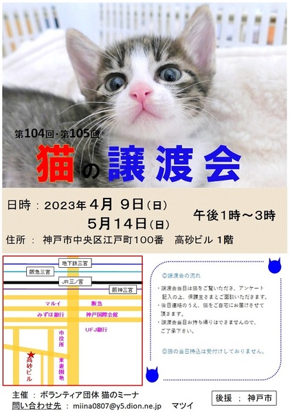 | イベント内容 | 大人猫やちょっと大きくなった猫と、たくさんの猫たちが参加予定です。 保護された猫たちが参加して、新しいお家を求めて参加します(=^・^=) 猫は後日こちらからお届けをさせて頂き、お家の環境を見せて頂ければと思います。 猫は20年くらい生きる子もいますので、ご自身の年齢に合った猫さんとの出会いを探しに来てください。 ペット不可にお住まいの方はご遠慮ください!(ご確認してください。) 譲渡には条件が多数ありますので、ご理解くださいませ<m(__)m>。 まずはお試しで猫との相性を見てから、正式譲渡となります。 また、猫を保護して里親を探そうと思われている方も、参加猫の募集をしていますので、お申し込みくださいね! アドレス miina0807@y5.dion.ne.jp にご連絡をください。 お越しの際は各路線の三宮駅からは徒歩10分くらい、車でお越しの場合は近隣のコインパーキングなどにお停めください。 当日、体調の悪い方、発熱がある方、このような方はご遠慮ください。 毎月譲渡会を開催しておりますので、次回の出会いに期待をしてくださいね。 こちらでは、体温チェックや消毒をし、万全を期しております。 密にならないように、人数制限をしておりますので、お待ち頂く場合があります。 ブログ: 猫のミーナといっしょ http://miina300.blog.fc2.com/ ねこのオカン https://ameblo.jp/miina300/ |