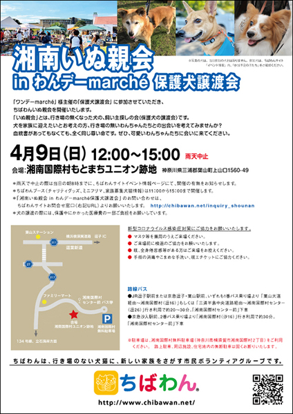 | イベント内容 | 湘南国際村で開催される『わんデーmarché保護犬の譲渡会』に参加します。 本当の家族との出会いを待っている、ちばわんの可愛い保護犬たちに会いに来てください。 イベントの詳細はちばわんホームページでご確認ください。 https://chibawan.net/event_other/20230409-wandaymarche-dog いぬ親会についての問い合わせは下記までお願いします。 https://chibawan.net/inquiry_shounan 件名に【湘南いぬ親会 問い合わせ】とご記入下さい。 ※いぬ親会に関するお問合せは、開催前日までにお願いいたします。 【ちばわんいぬ親会の流れ】 ≪お願い≫ 臆病な性格の犬や子どもさんを苦手とする犬も参加することがあります。まずは預かりボランティアに声をおかけください。 ① 気になる犬の預かりボランティアと話をしてみてください。 ②ご希望の犬が決まったら、アンケートフォームにご記入ください。 アンケート内容を拝見し、お話させていただきます。 参加犬でご希望の犬が決まっている場合は、事前にアンケートを送信していただければお話がスムーズに進みます。 →お申込みアンケートhttps://chibawan.net/contactform_dog ③原則として一両日中に譲渡の可否を連絡いたします。 いぬ親会場でのお引き渡しはできません。 ④ご縁が成立した場合には、後日こちらからご自宅まで犬をお届けし、約1か月間のお試し生活が始まります。 お届けの際に、「譲渡契約書」を交わします。 ※ワクチン・不妊手術代など、保護犬にかかった費用の一部は、家族になっていただく方にもご負担をお願いしています。 ☆預かりボランティアとは? ちばわんでは、保護した犬を一時預かりとして、ボランティアの家庭で日常の世話をしています。そのためその子の性格や様子を詳しく聞くことができます。 【その他】 ◆ご質問など、お気軽に会場ボランティアにお声掛けください。 |