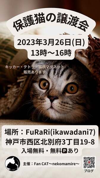| イベント内容 | 猫の譲渡会 2023年3月26日(日)13時~16時 神戸市西区北別府3丁目19-8 https://goo.gl/maps/Cq15cEHSiWqmYVC8A Fu・Ra・Ri(ikawadani7)無料パーキングあります 長毛の猫さん参加しています! 中猫さんたちたくさん参加していますので是非ご参加ください!! 参加の猫ちゃんたちはブログにて掲載しています 参加猫ちゃんイベント情報に写真掲載しています https://mycatkobe.blog.fc2.com/ お見合いしたいと思われる方は、ブログのメールフォームにお越しになる時間をご連絡ください ※譲渡は無料ではございません(譲渡会参加は無料です) ※譲渡条件がございます ※当日連れて帰れません ※※早い順ではございませんがご縁があれば早くに決まってしまう 場合がありますのでお見合いの予約かお早めにご来場ください 主催 Fan CAT~nekomamire~ |